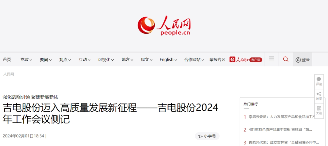 2月1日,人民網(wǎng)刊發(fā)《強(qiáng)化戰(zhàn)略引領(lǐng) 聚焦新域新質(zhì) 吉電股份邁入高質(zhì)量發(fā)展新征程》一文。報(bào)道稱,吉電股份作為國家“雙碳”戰(zhàn)略矢志不渝的踐行者,堅(jiān)持深耕吉林和全國化發(fā)展并行的全局戰(zhàn)略,保持戰(zhàn)略定力,強(qiáng)抓戰(zhàn)略機(jī)遇,錨定世界一流目標(biāo)不放松,超前謀劃布局,搶占優(yōu)質(zhì)資源,加快實(shí)施、落地見效、保持領(lǐng)先。以更加務(wù)實(shí)的態(tài)度、更加有力的措施、更加創(chuàng)新的思維,全面開啟向一流產(chǎn)業(yè)和一流企業(yè)進(jìn)軍的新征程。以下為報(bào)道全文: