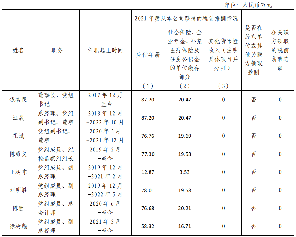 備注: 上表披露信息為我公司企業負責人 2021 年度全 部應發稅前薪酬 (不含 2021 年發放的以往年度薪酬)。