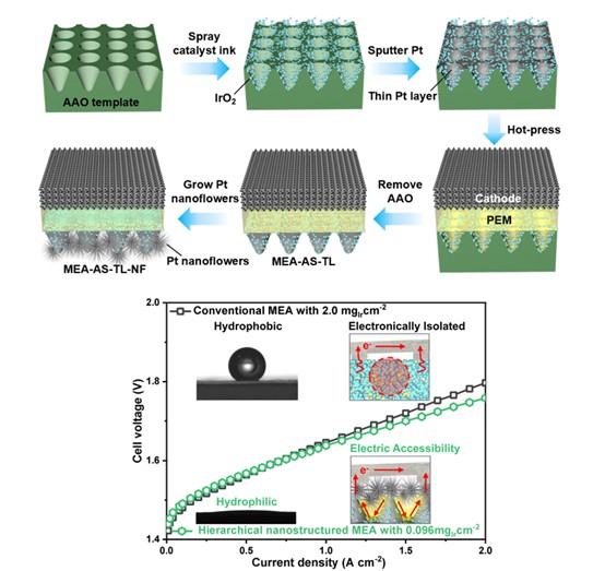 近期,中國(guó)科學(xué)院上海高等研究院研究團(tuán)隊(duì),提出“錐狀陣列+超薄Pt層+Pt納米花”的多層級(jí)結(jié)構(gòu)設(shè)計(jì)理念。研究通過精準(zhǔn)構(gòu)建納米壓印光刻、離子濺射、原位生長(zhǎng)三步工藝,可同時(shí)解決傳統(tǒng)MEA導(dǎo)電性和傳質(zhì)受限兩大痛點(diǎn)。同時(shí),超薄Pt層兼具使面內(nèi)導(dǎo)電性提升12.3倍,并作為成核位點(diǎn)誘導(dǎo)Pt納米花生長(zhǎng)的雙重功能,可實(shí)現(xiàn)結(jié)構(gòu)與性能協(xié)同優(yōu)化,進(jìn)而實(shí)現(xiàn)0.096mg cm??低Ir負(fù)載下的高性能,較傳統(tǒng)MEA節(jié)省95%以上Ir,且在2.0A cm??下槽壓(1.758V)優(yōu)于高Ir負(fù)載的傳統(tǒng)MEA(1.797V@ 2mg cm-2),為質(zhì)子交換膜水電解的低Ir化應(yīng)用提供了新思路。