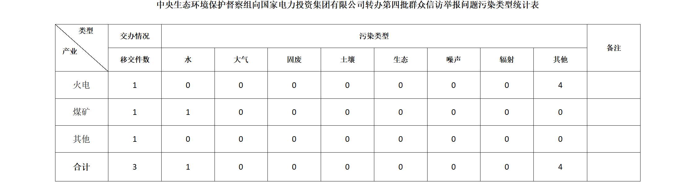 6月4日,中央第八生態環境保護督察組向國家電力投資集團有限公司移交第四批群眾信訪舉報件3件,其中來電1件,來信2件。涉及水問題1個,其他問題4個。所有舉報件辦理工作已第一時間進入調查核實辦理程序,辦理情況將按照相關要求反饋督察組,并及時向社會公開。